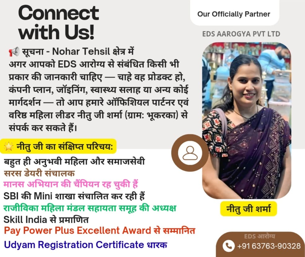 अगर आपको EDS आरोग्य से संबंधित किसी भी प्रकार की जानकारी चाहिए — चाहे वह प्रोडक्ट हो, कंपनी प्लान, जॉइनिंग, स्वास्थ्य सलाह या अन्य कोई मार्गदर्शन — तो आप हमारे ऑफिशियल पार्टनर एवं वरिष्ठ महिला लीडर नीतु जी शर्मा (ग्राम: भूकरका) से संपर्क कर सकते हैं।🌳